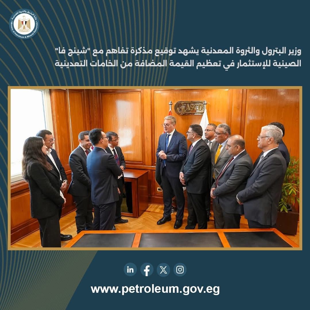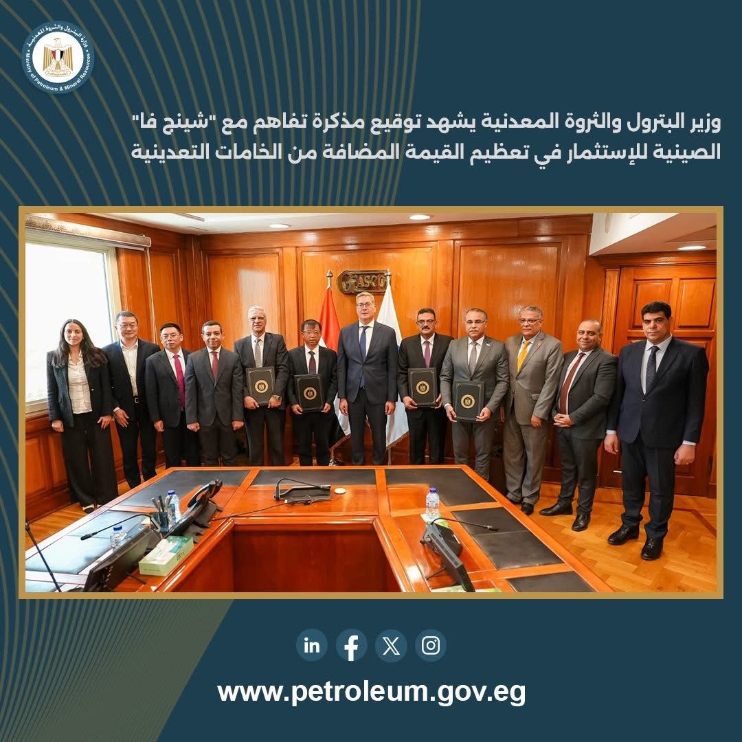 وزير البترول يشهد توقيع مذكرة تفاهم مع "شينج فا" الصينية لتعظيم القيمة المضافة من الخامات التعدينية