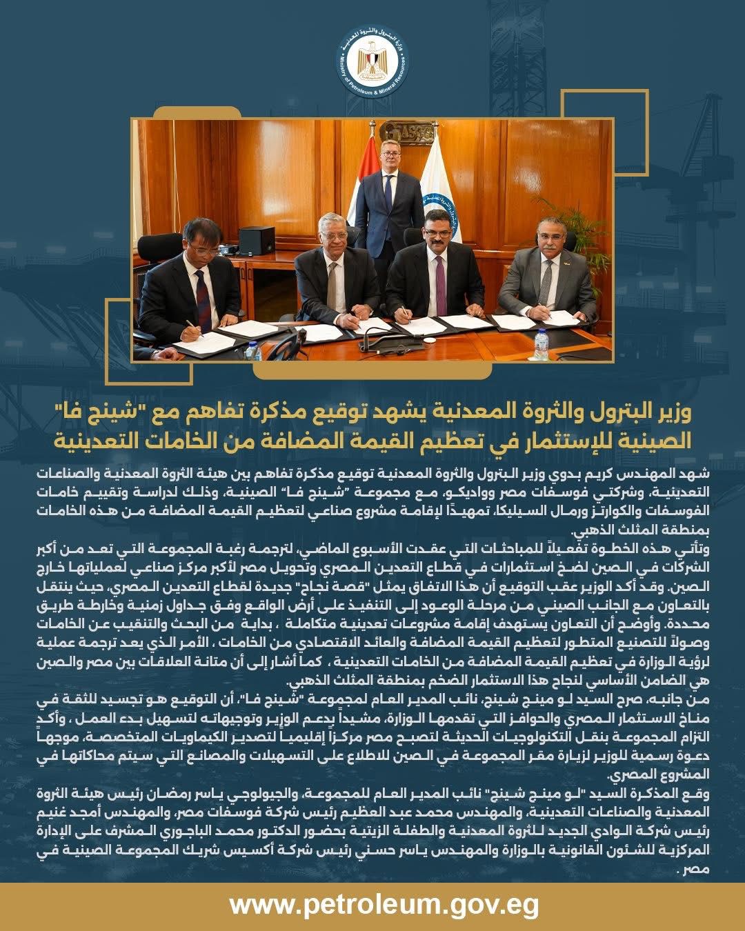 شهد المهندس كريم بدوي وزير البترول والثروة المعدنية توقيع مذكرة تفاهم بين هيئة الثروة المعدنية والصناعات التعدينية، وشركتي فوسفات مصر وواديكو، مع مجموعة “شينج فا” الصينية، وذلك لدراسة وتقييم خامات الفوسفات والكوارتز ورمال السيليكا، تمهيدًا لإقامة مشروع صناعي لتعظيم القيمة المضافة من هذه الخامات بمنطقة المثلث الذهبي.