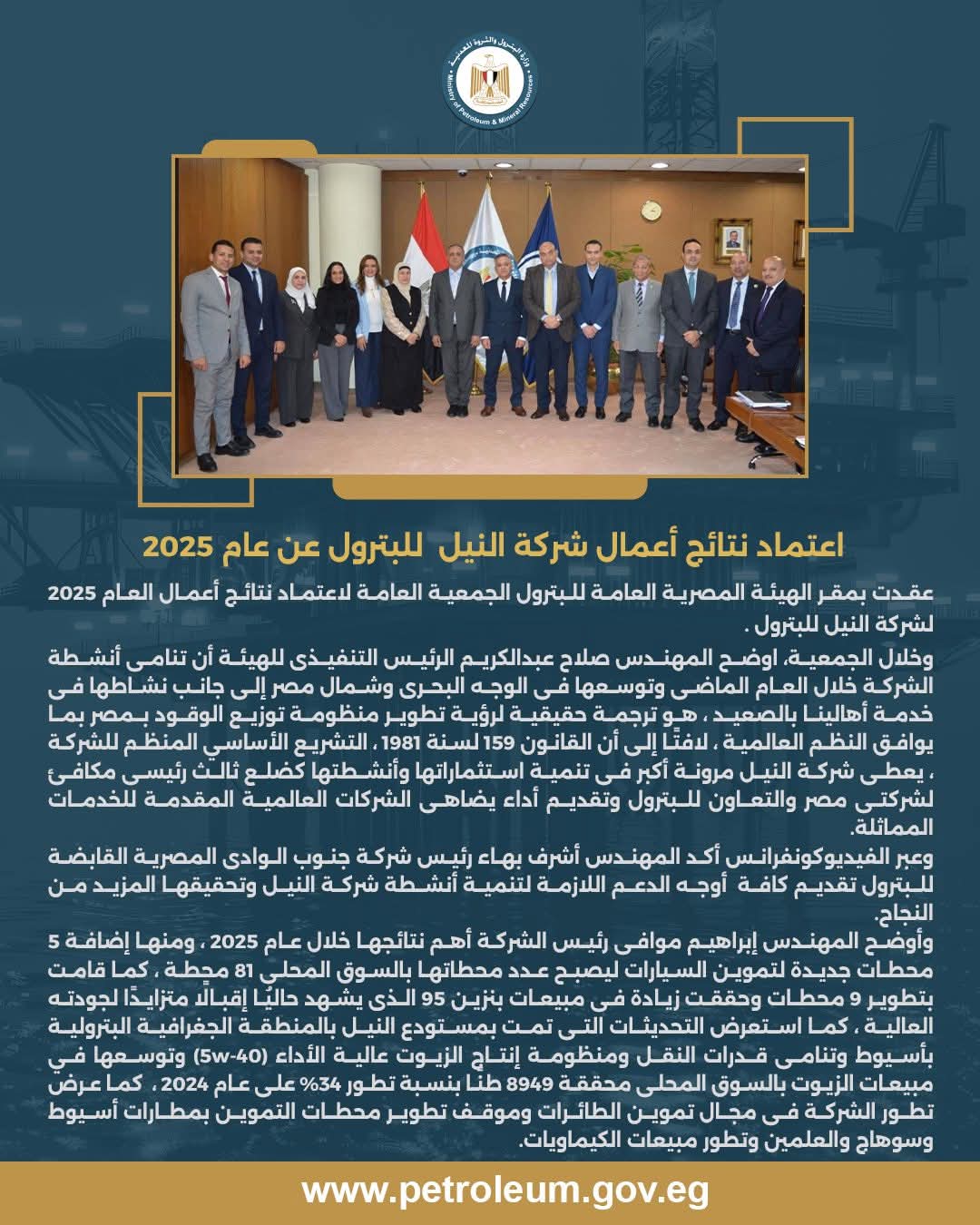 عقدت بمقر الهيئة المصرية العامة للبترول الجمعية العامة لاعتماد نتائج أعمال العام 2025 لشركة النيل للبترول .