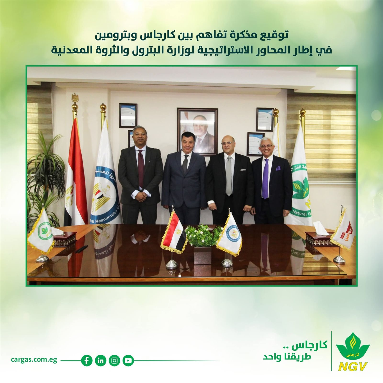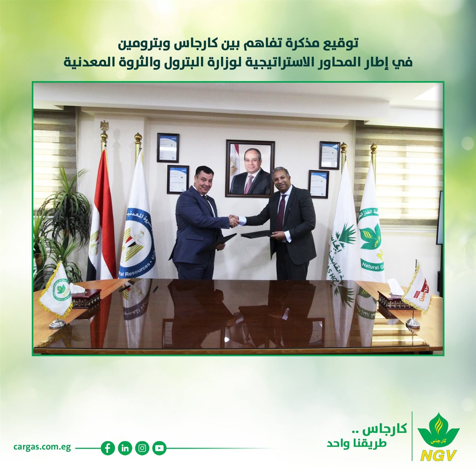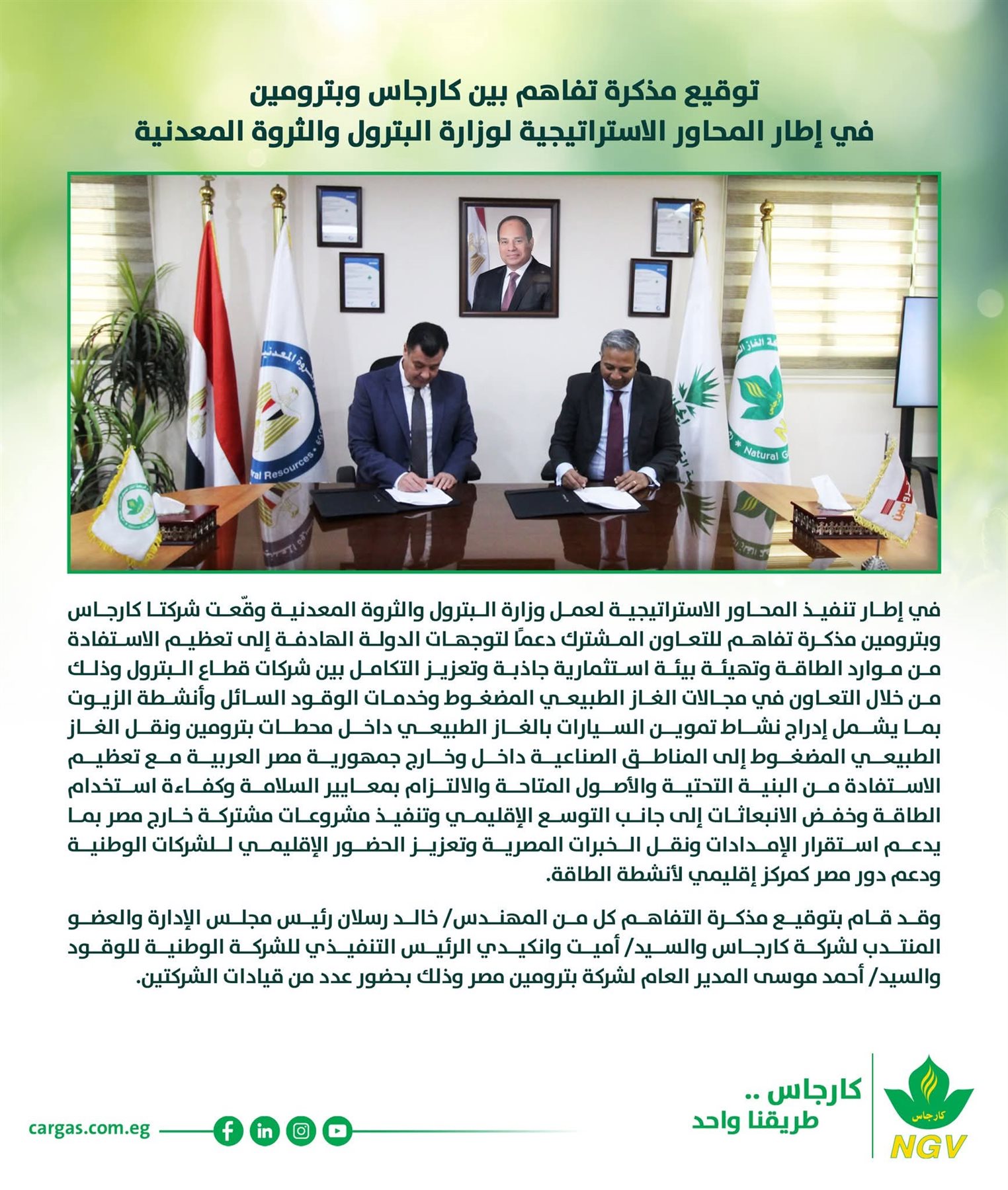 في إطار تنفيذ المحاور الاستراتيجية لعمل وزارة البترول والثروة المعدنية وقّعت شركتا كارجاس وبترومين مذكرة تفاهم للتعاون المشترك دعمًا لتوجهات الدولة الهادفة إلى تعظيم الاستفادة من موارد الطاقة وتهيئة بيئة استثمارية جاذبة وتعزيز التكامل بين شركات قطاع البترول وذلك من خلال التعاون في مجالات الغاز الطبيعي المضغوط وخدمات الوقود السائل وأنشطة الزيوت بما يشمل إدراج نشاط تموين السيارات بالغاز الطبيعي داخل محطات بترومين ونقل الغاز الطبيعي المضغوط إلى المناطق الصناعية داخل وخارج جمهورية مصر العربية مع تعظيم الاستفادة من البنية التحتية والأصول المتاحة والالتزام بمعايير السلامة وكفاءة استخدام الطاقة وخفض الانبعاثات إلى جانب التوسع الإقليمي وتنفيذ مشروعات مشتركة خارج مصر بما يدعم استقرار الإمدادات ونقل الخبرات المصرية وتعزيز الحضور الإقليمي للشركات الوطنية ودعم دور مصر كمركز إقليمي لأنشطة الطاقة.