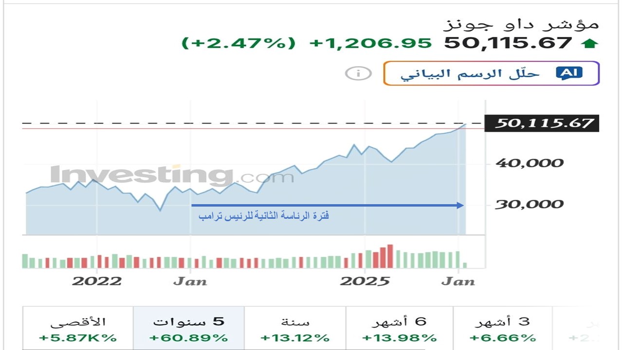 الفترة الثانية للرئيس ترامب (يناير 2025–الان): سجّل مؤشر داو جونز الصناعي قفزة تاريخية خلال تداولات الجمعة بتجاوزه مستوى 50 ألف نقطة للمرة الأولى فى التاريخ الأمريكى (أنظر الرسم البيانى المرفق)، مدفوعًا بموجة صعود قوية في أسهم الشركات القيادية، وسط تنامي ثقة المستثمرين في أداء الاقتصاد الأمريكي ونتائج الشركات، وهذا مؤشر نجاح لسياسة الرئيس ترامب خلال فترتة الرئاسية الثانية والتى تفوق نظيرتها فى فترته الأولى.