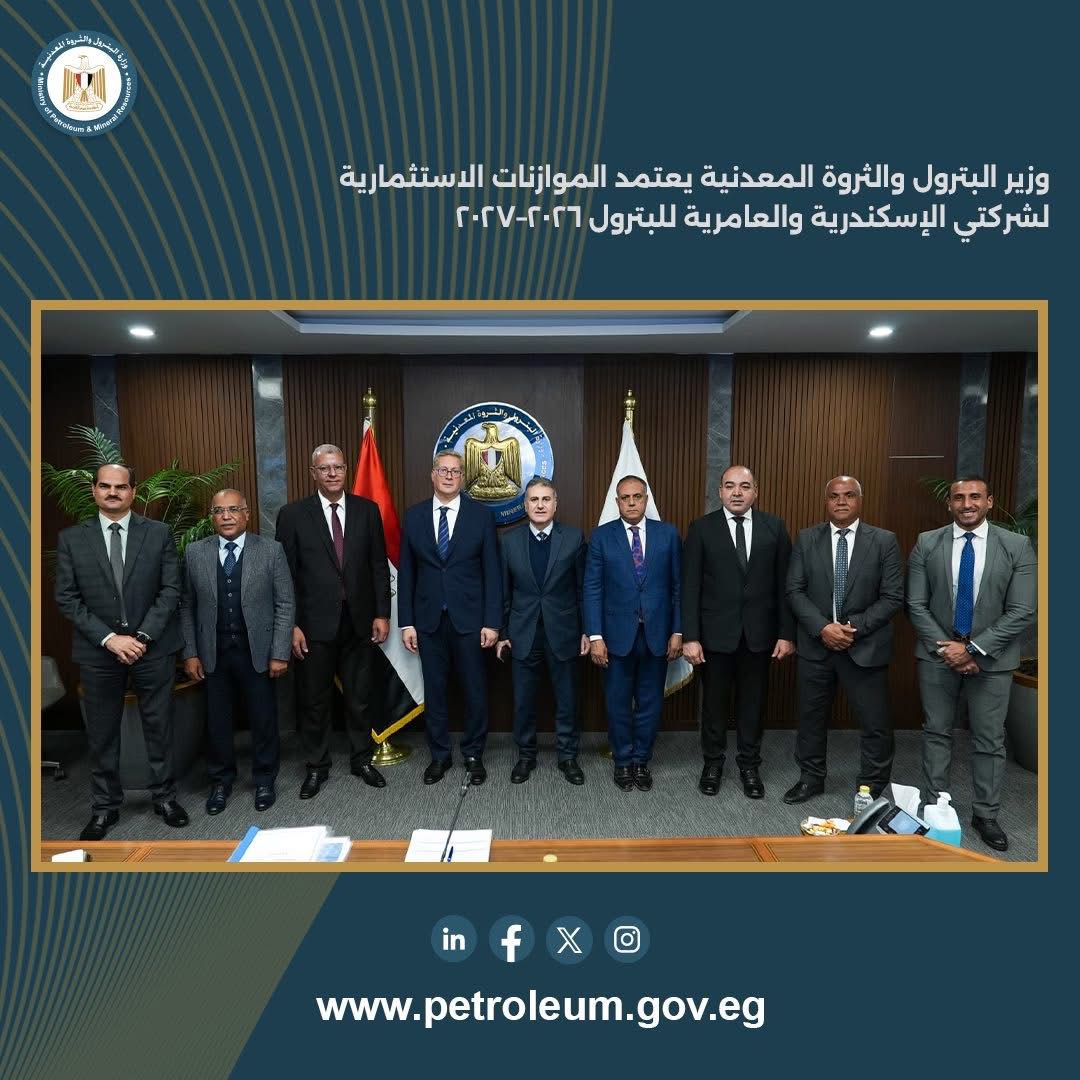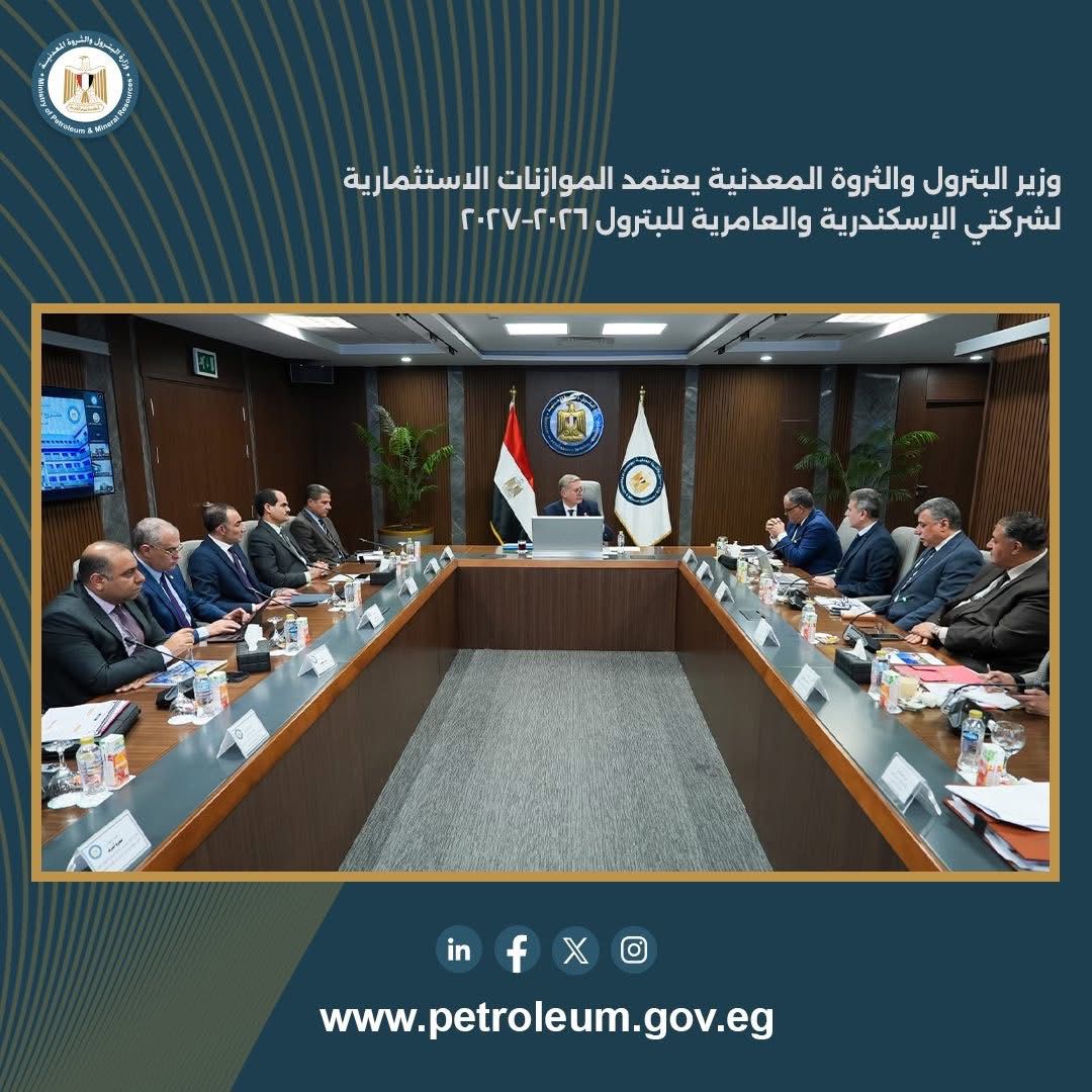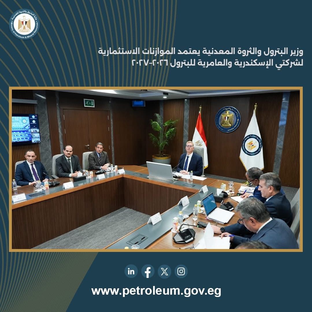 اعتمد المهندس كريم بدوي، وزير البترول والثروة المعدنية، الموازنة الاستثمارية لكلٍ من شركة الإسكندرية للبترول وشركة العامرية لتكرير البترول للعام المالي 2026–2027، وذلك بحضور الفريق كامل الوزير، نائب رئيس مجلس الوزراء للتنمية الصناعية ووزير الصناعة والنقل، عبر الفيديو كونفرانس، والدكتور محمود عصمت، وزير الكهرباء والطاقة المتجددة، والدكتورة منال عوض، وزيرة التنمية المحلية والقائمة بأعمال وزير البيئة.