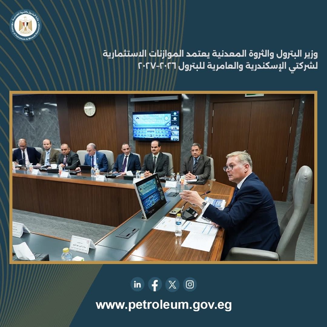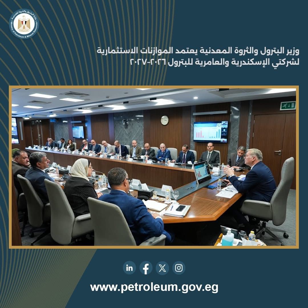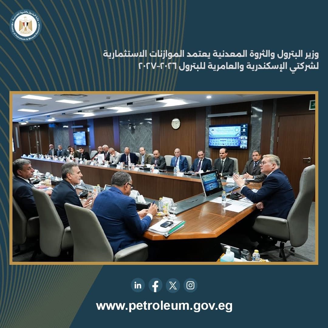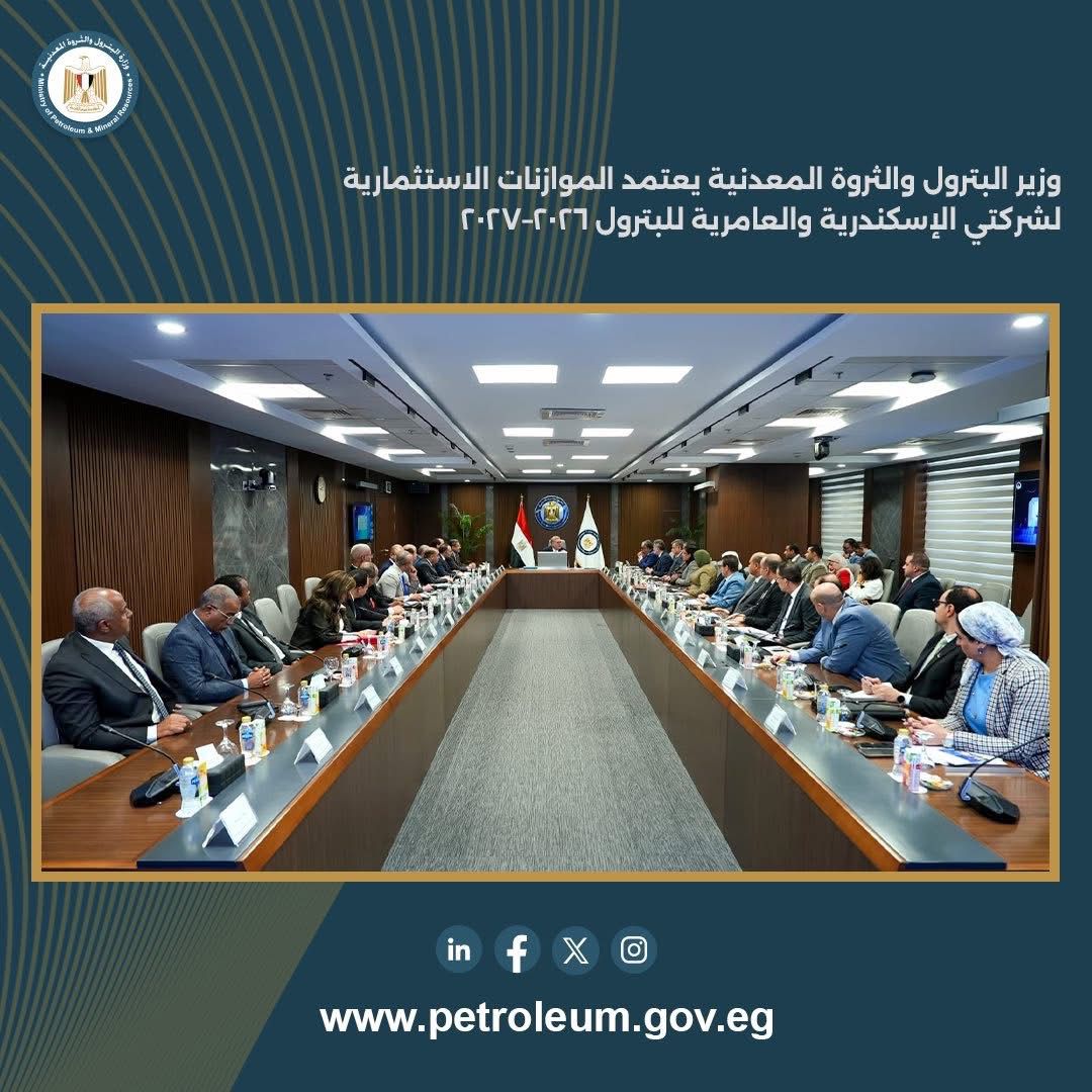 اعتمد المهندس كريم بدوي، وزير البترول والثروة المعدنية، الموازنة الاستثمارية لكلٍ من شركة الإسكندرية للبترول وشركة العامرية لتكرير البترول للعام المالي 2026–2027، وذلك بحضور الفريق كامل الوزير، نائب رئيس مجلس الوزراء للتنمية الصناعية ووزير الصناعة والنقل، عبر الفيديو كونفرانس، والدكتور محمود عصمت، وزير الكهرباء والطاقة المتجددة، والدكتورة منال عوض، وزيرة التنمية المحلية والقائمة بأعمال وزير البيئة.