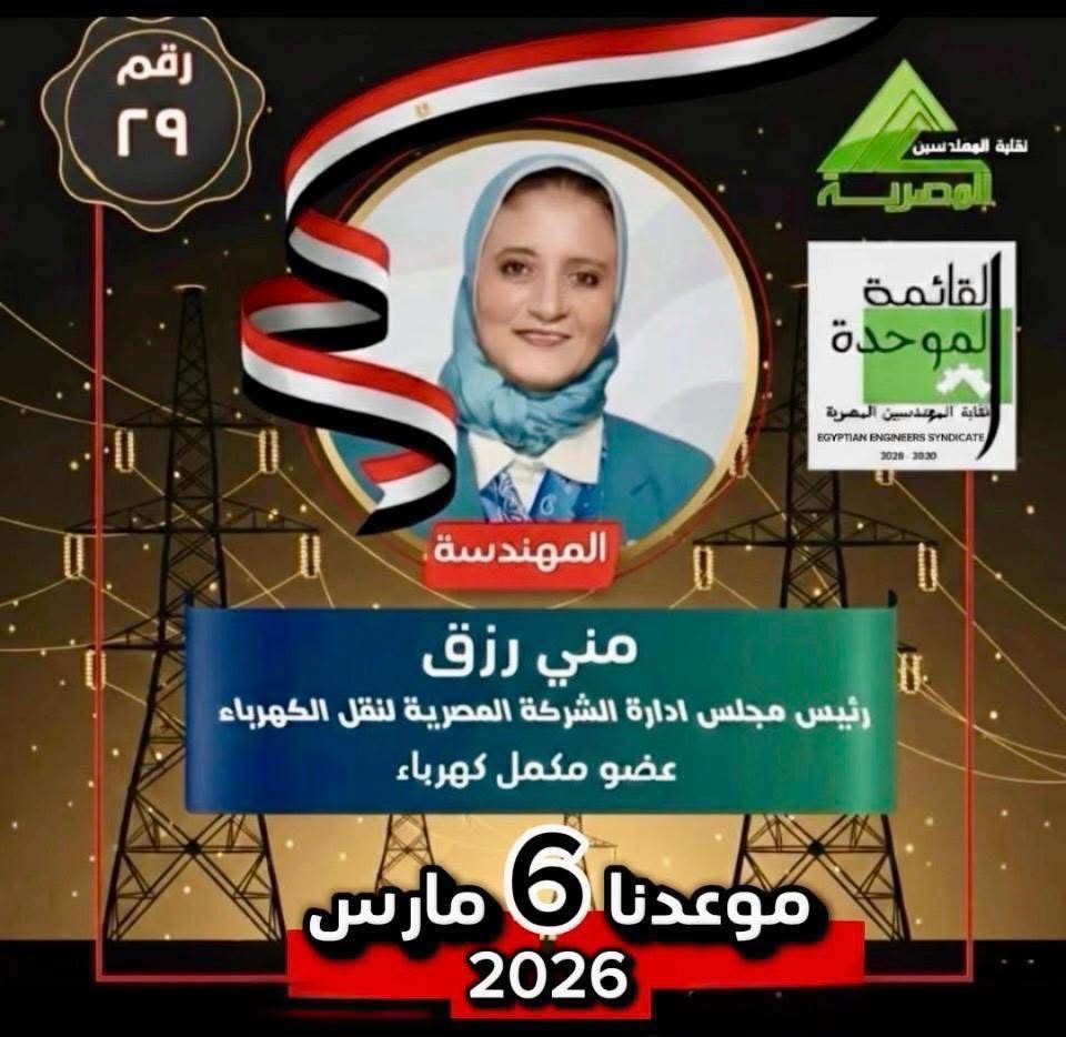 في إطار دعم الكفاءات الهندسية المصرية ورفع مستوى التمثيل داخل نقابة المهندسين، عبّر عدد من قيادات الشركة المصرية لنقل الكهرباء ومنطقة القناة لنقل الكهرباء عن تأييدهم ومساندتهم للمهندسة منى رزق، رئيسة مجلس إدارة الشركة المصرية لنقل الكهرباء، المرشحة على مقعد عضوية النقابة العامة للمهندسين.