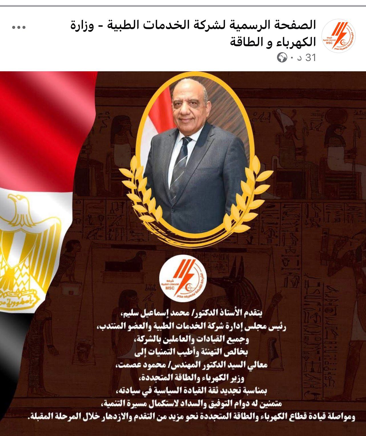 كما تقدم الاستاذ الدكتور محمد إسماعيل رئيس مجلس ادارة شركة الخدمات الطبية وجميع مجلس ادارة الشركة والقيادات والعاملين بخالص التهاني القلبية للدكتور مهندس محمود عصمت مؤكدين مواكبة العمل نحو تقديم خدمة طبية متميزة لجموع العاملين في القطاع وتحقيق كافة المتطلبات خلال الفترات المقبلة بفضل تنفيذ توجيهات وتعليمات معالي وزير الكهرباء والطاقة المتجددة ٠٠٠