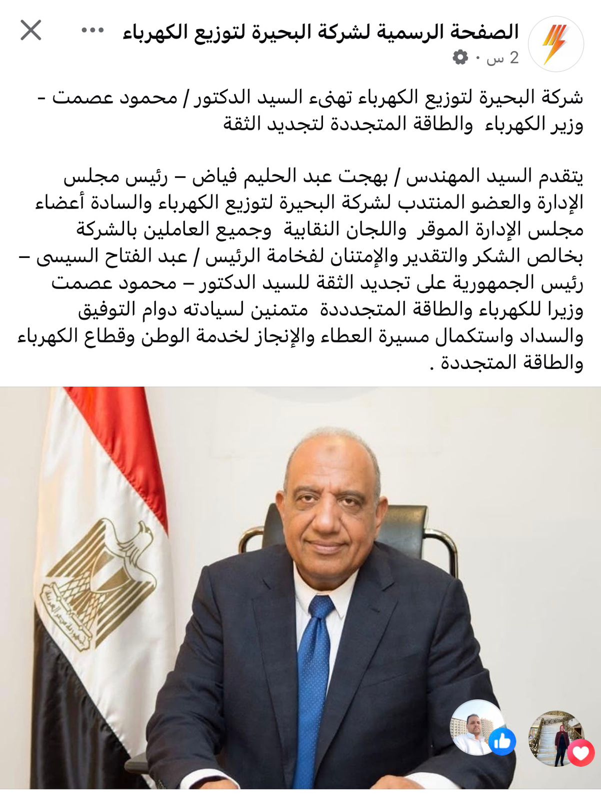 بالأسماء..برقيات تهنئةوتجديد عهد من قيادات «الكهرباء»بعد استمرار الثقة في «الوزير»
