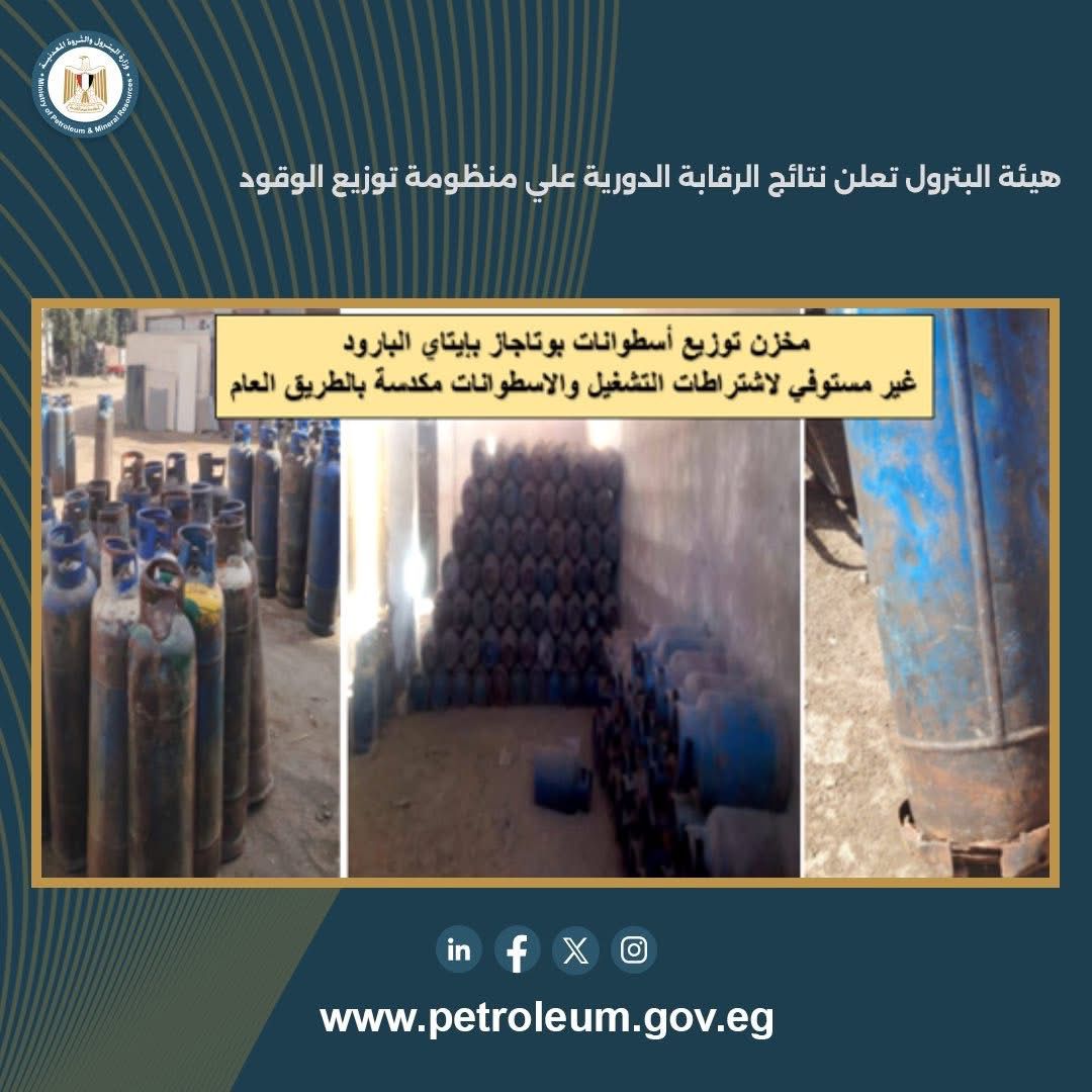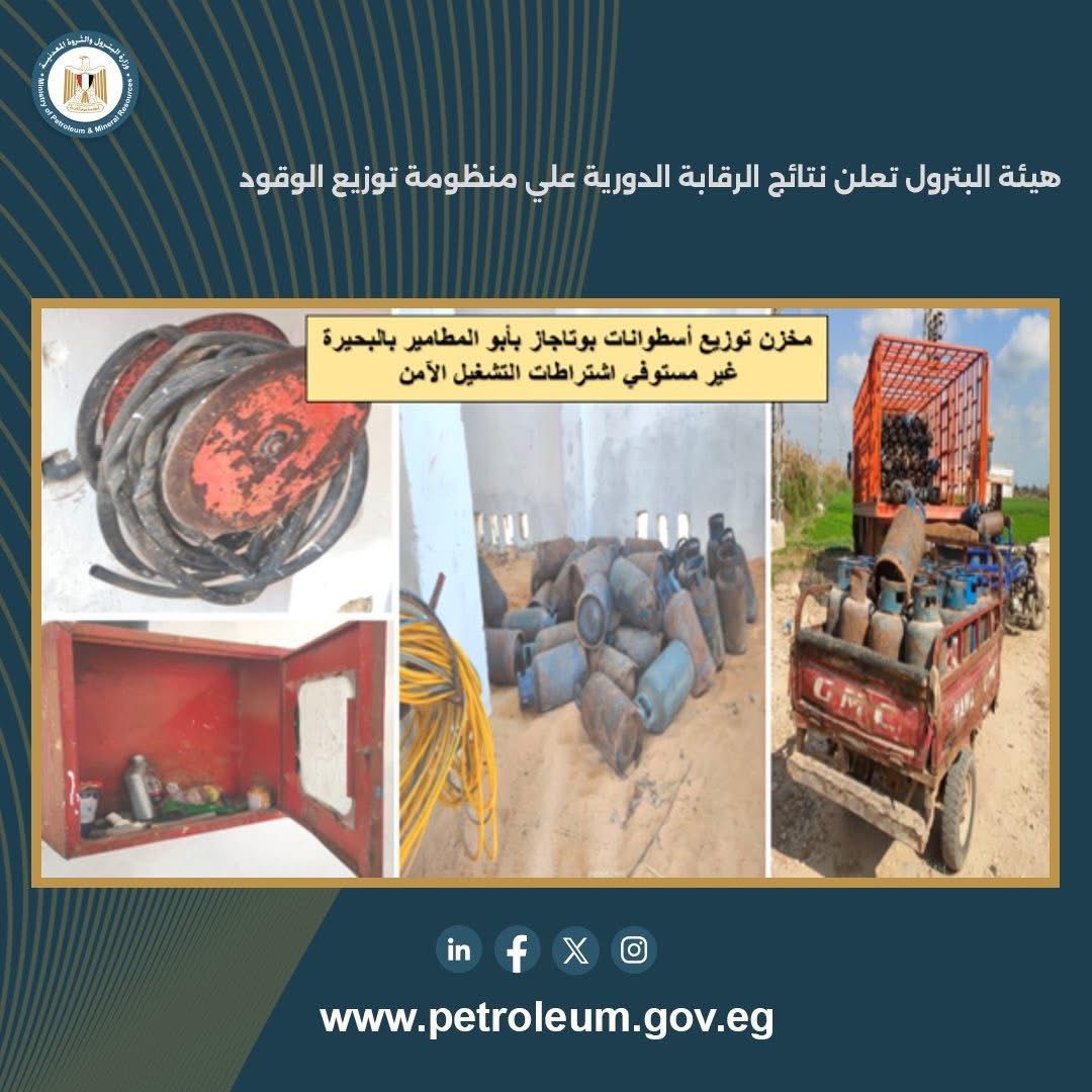 التفتيش علي مخزني توزيع أسطوانات بوتاجاز بمركزي أبو المطامير وإيتاي البارود بمحافظة البحيرة وتبين عدم استيفائهم لاشتراطات الأمان وغياب وسائل الاطفاء بالإضافة لتكديس الأسطوانات بالطريق العام ومنها غير صالحة للتداول وقد تم اخطار الشركة المعنية لسرعة تلافي ذلك .