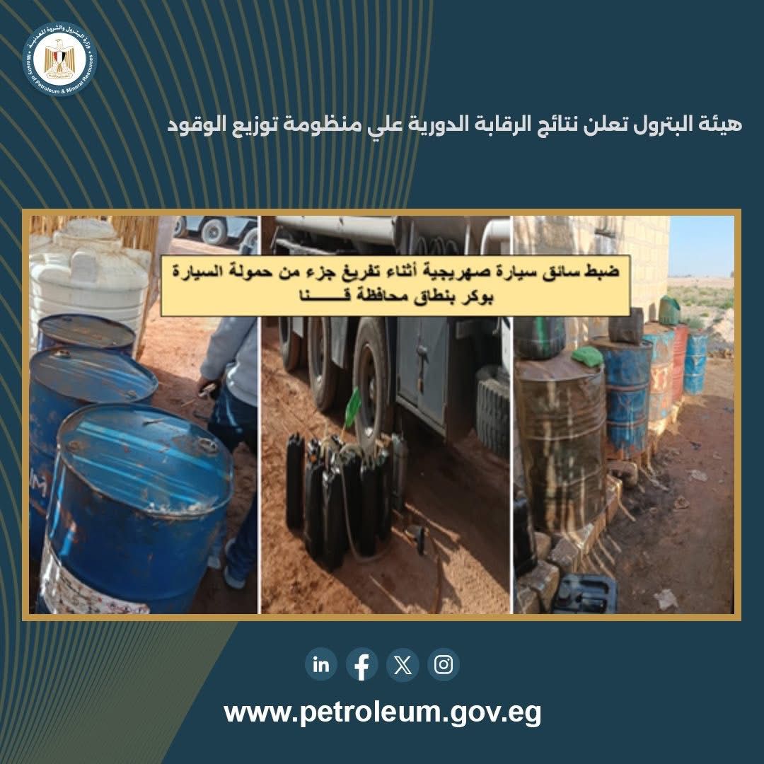 تم ضبط وكرين لتجميع المنتجات البترولية المسروقة أحدهما بمحافظة قنا والأخر بالطريق الدولي الساحلي بمحافظة كفر الشيخ) حيث تم ضبط سيارتين داخل تلك الأوكار أثناء سرقة جزء من الحمولة بمعرفة السائقين والتفريغ ببراميل وجراكن وقد تم القبض عليهم وتحويلهم للنيابة ، كما أصدر المهندس صلاح عبدالكريم الرئيس التنفيذي للهيئة تعليمات بحظر السيارات المضبوطة والسائقين من الدخول نهائياً لأي مستودع تابع للقطاع وتطبيق الغرامات المالية.