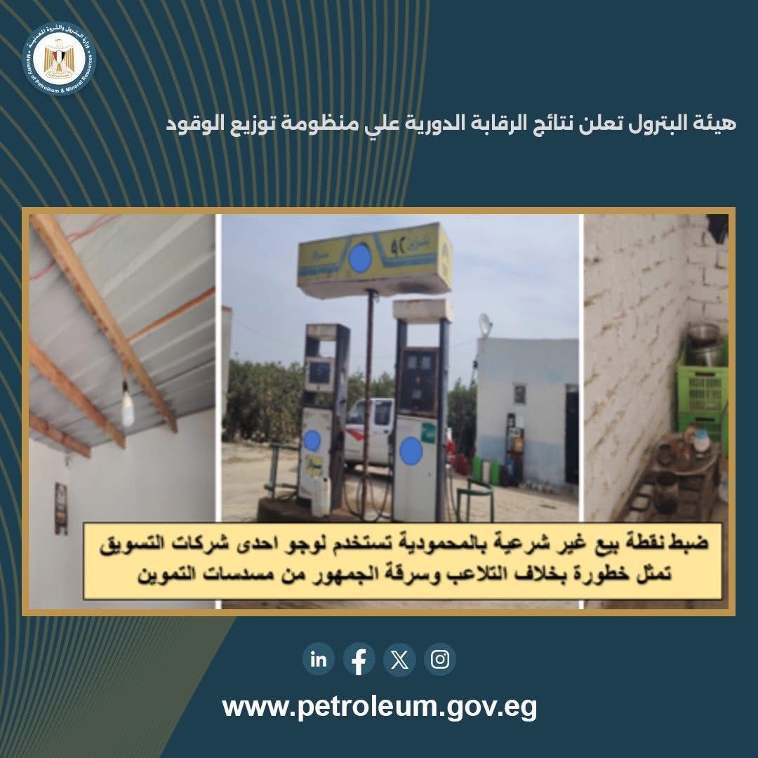 ضبط (3) نقاط بيع غير شرعية بمحافظة البحيرة غير مستوفية لاشتراطات الأمان واحداها تستغل لوجو احدى شركات التسويق بخلاف التلاعب وسرقة الجمهور في كميات الوقود ، وتم اتخاذ الإجراءات القانونية ضدها.