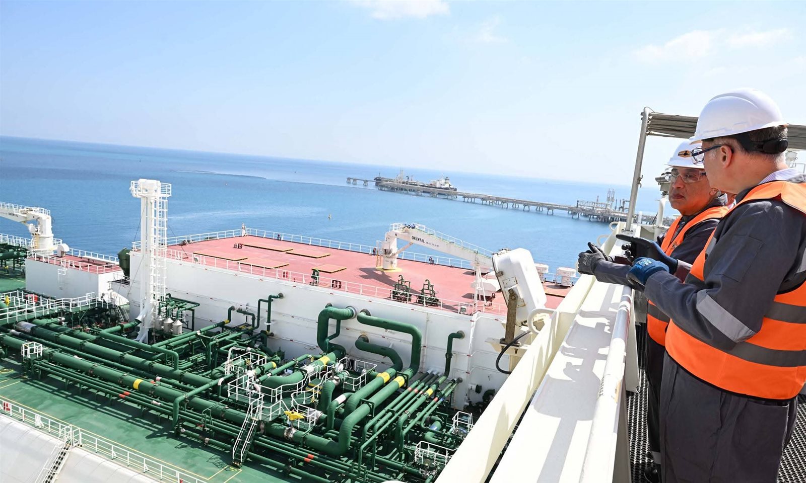 وفي غضون ذلك، استعرض رئيس الشركة إمكانات محطة تداول وتخزين المنتجات البترولية والغاز الطبيعي المسال، والرصيف البحري الخاص بها الممتد بطول 3 كم، والذي يضم ثلاثة مراسي بحرية لاستقبال ناقلات المنتجات البترولية وسفن التغويز لضخ الغاز المسال، بأعماق تصل إلى 19 مترًا، بما يتيح استقبال أكبر ناقلات المنتجات البترولية والغاز المسال في العالم.