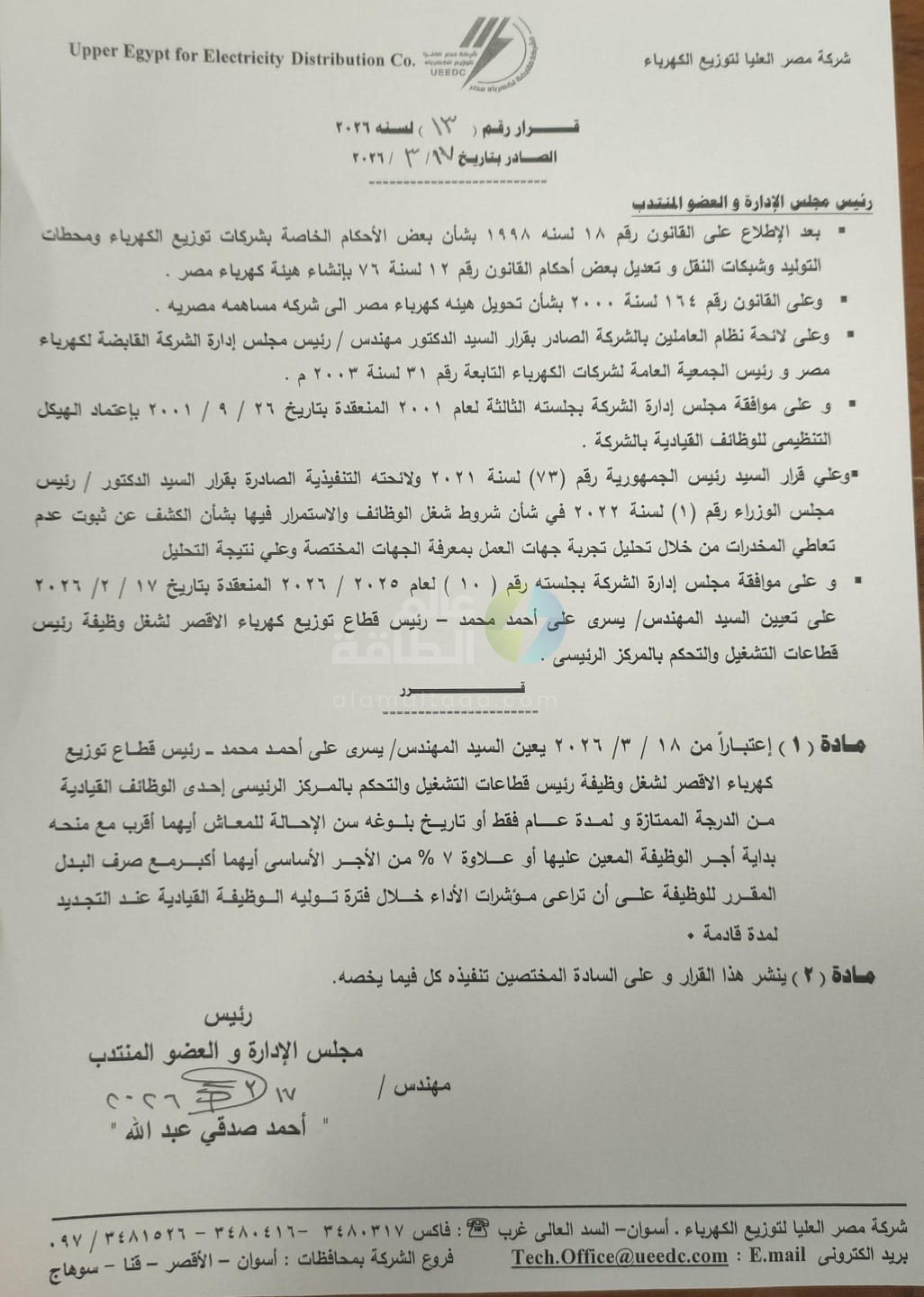 وجاء القرار في إطار خطة الشركة لدعم الهيكل القيادي وتعزيز كفاءة منظومة التشغيل والتحكم، بما يسهم في رفع مستوى الأداء وتحقيق الاستقرار للشبكة الكهربائية بنطاق عمل الشركة في محافظات الصعيد.