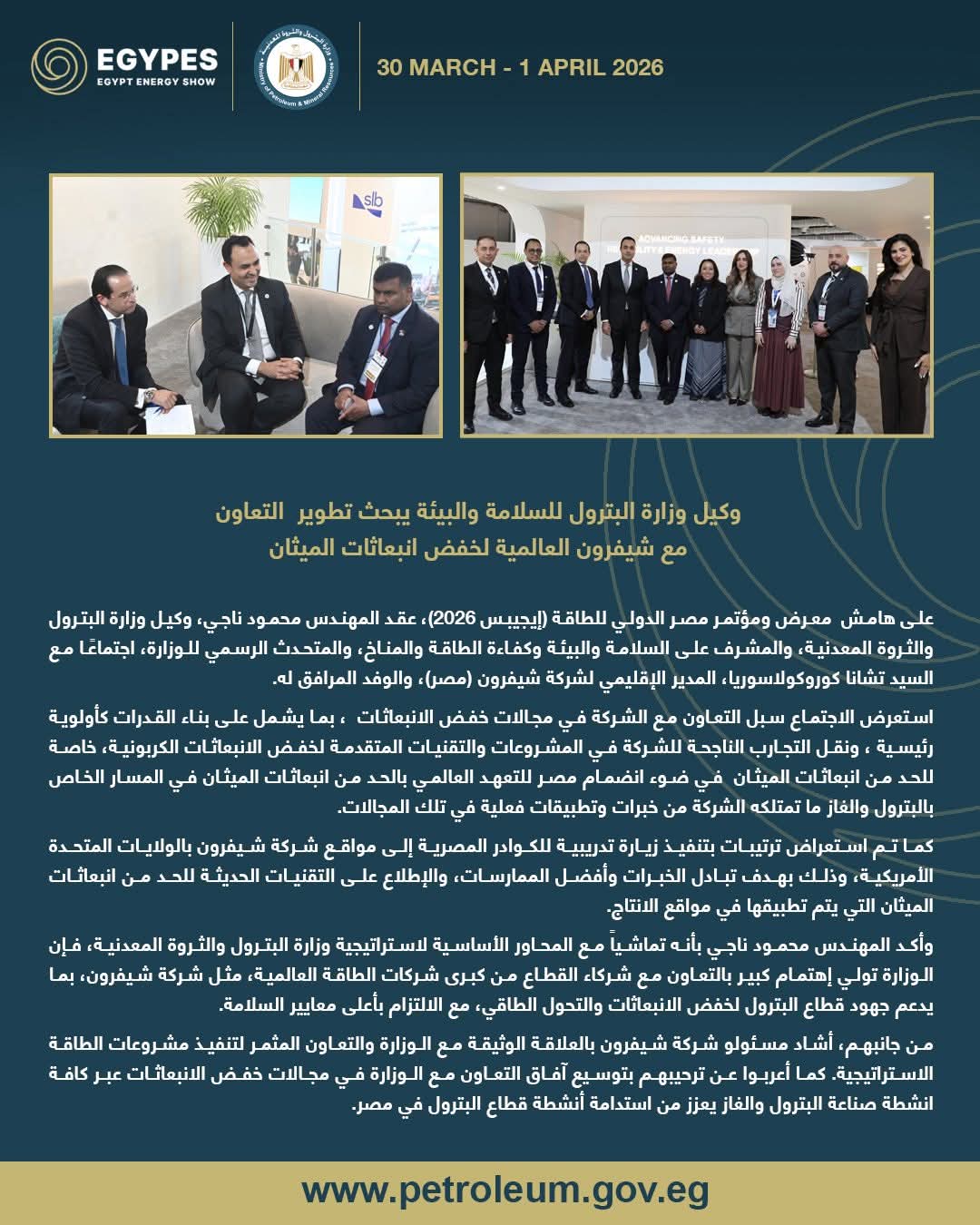 وأكد المهندس محمود ناجي بأنه تماشياً مع المحاور الأساسية لاستراتيجية وزارة البترول والثروة المعدنية، فإن الوزارة تولي إهتمام كبير بالتعاون مع شركاء القطاع من كبرى شركات الطاقة العالمية، مثل شركة شيفرون، بما يدعم جهود قطاع البترول لخفض الانبعاثات والتحول الطاقي، مع الالتزام بأعلى معايير السلامة.