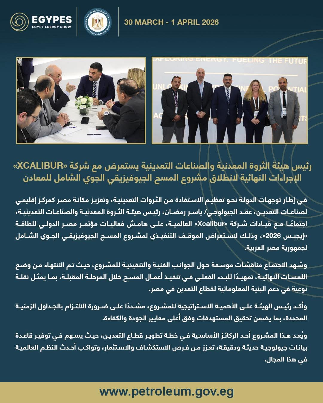 في إطار توجهات الدولة نحو تعظيم الاستفادة من الثروات التعدينية، وتعزيز مكانة مصر كمركز إقليمي لصناعات التعدين، عقد الجيولوجي/ ياسر رمضان، رئيس هيئة الثروة المعدنية والصناعات التعدينية، اجتماعًا مع قيادات شركة «Xcalibur» العالمية، على هامش فعاليات مؤتمر مصر الدولي للطاقة «إيجبس 2026»، وذلك لاستعراض الموقف التنفيذي لمشروع المسح الجيوفيزيقي الجوي الشامل لجمهورية مصر العربية.