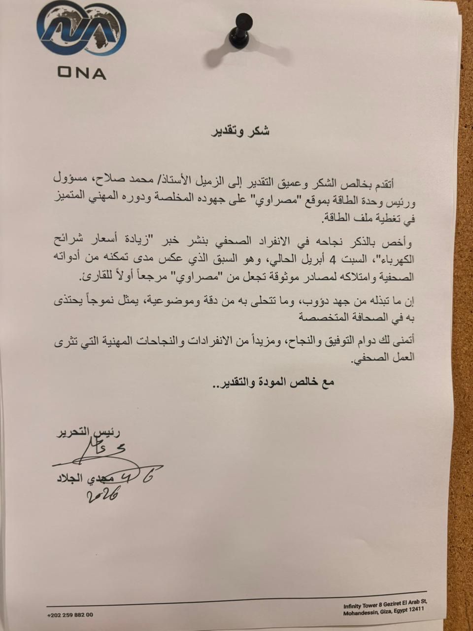 وأكد الجلاد، في خطاب رسمي، أن محمد صلاح نجح في تحقيق انفراد صحفي مهم بنشر خبر «زيادة أسعار شرائح الكهرباء» في توقيت مبكر، وهو ما يعكس امتلاكه أدوات صحفية قوية وقدرته على الوصول إلى مصادر موثوقة، جعلت من «مصراوي» منصة رائدة ومصدرًا أساسيًا للمعلومات في هذا القطاع الحيوي.