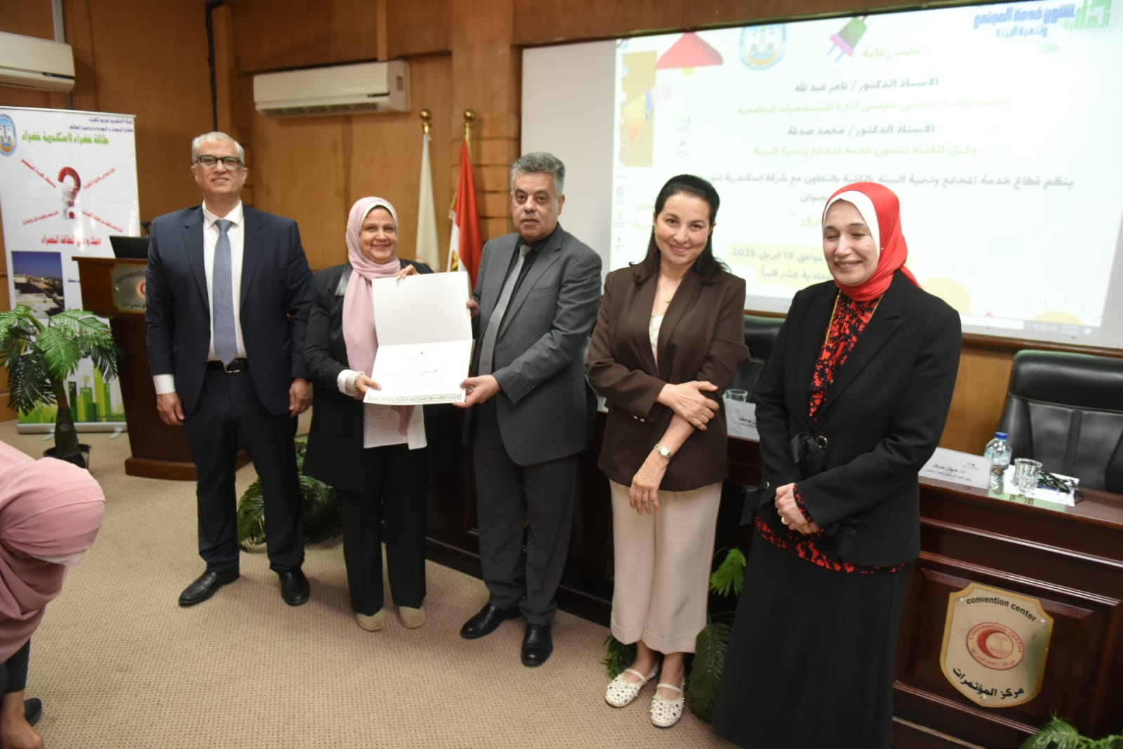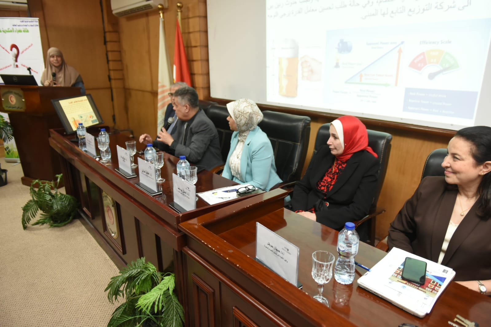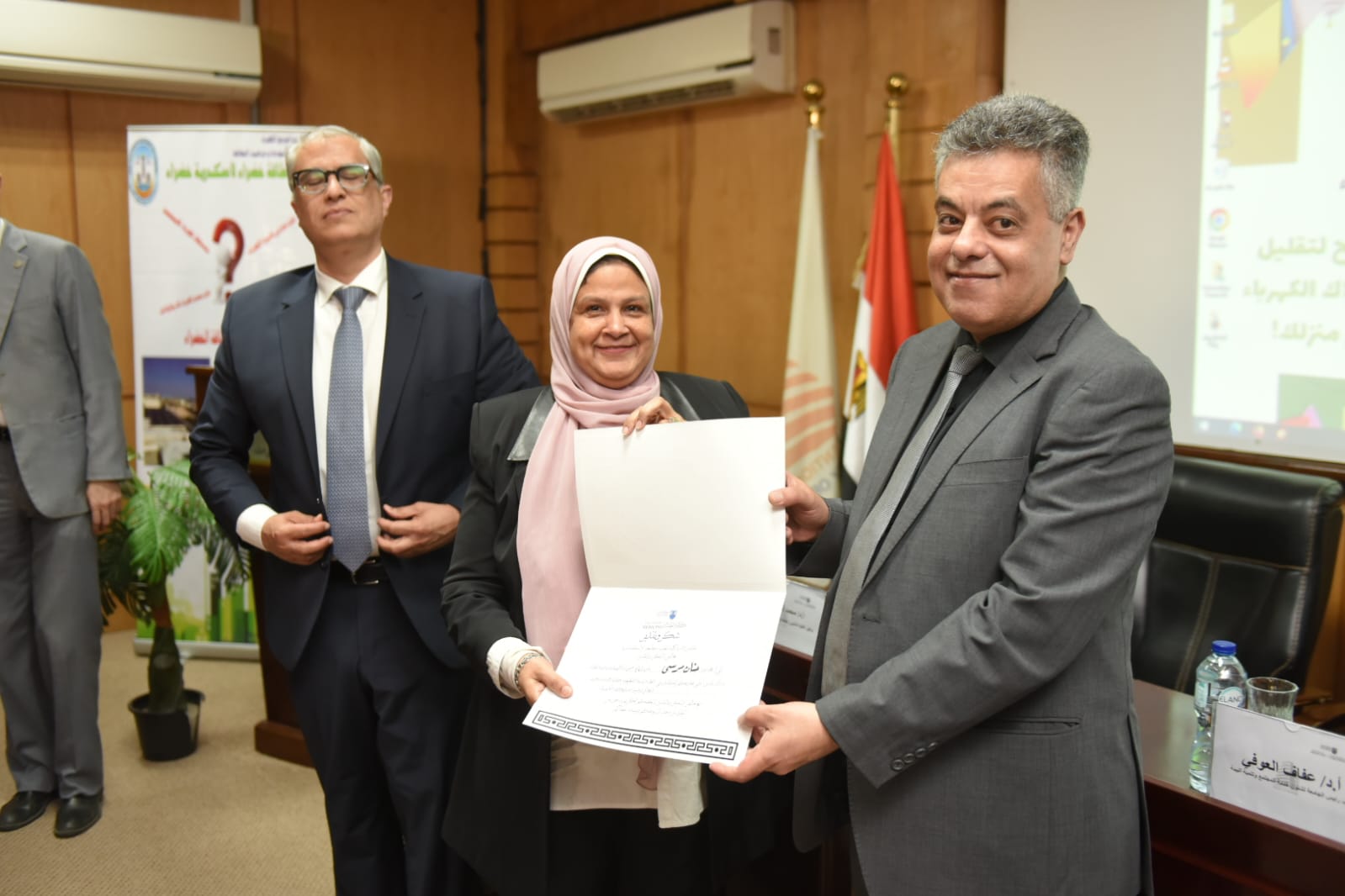 المهندسة /حنان مرسى رئيس قطاع البحوث والجودة وترشيد استخدام الطاقة الكهربائية والدكتورة المهندسة / هناء كراويه مدير عام ترشيد الطاقة والمهندسة / شهيرة أحمد عبد الجواد مهندس أول بقطاع ترشيد الطاقة و بحضور من جامعة الإسكندرية السادة / الأستاذة الدكتورة / عفاف العوفى نائب رئيس جامعة الإسكندرية لخدمة المجتمع وتنمية البيئة