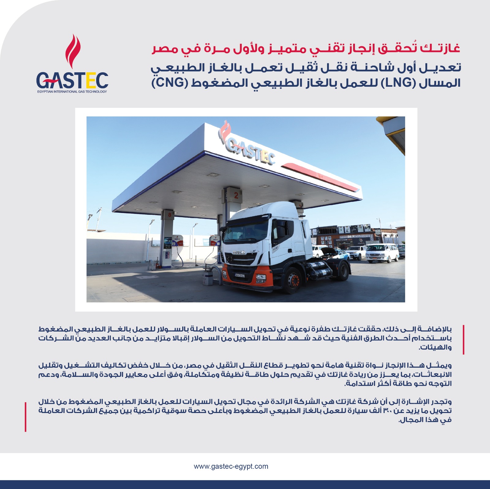 في إطار إستراتيجية وزارة البترول والثروة المعدنية لتعظيم الاستفادة من موارد الغاز الطبيعي، وفي ضوء سعي شركة غازتك لتطوير حلول غير تقليدية من شأنها الإسهام في دعم النقل المستدام، نجحت الشركة في تحقيق إنجاز تقني متميز ولأول مرة في مصر من خلال تعديل أول شاحنة نقل ثقيل تعمل بالغاز الطبيعي المسال (LNG) للعمل بالغاز الطبيعي المضغوط (CNG)، حيث تم تطوير نظام مبتكر بديل للنظام الأصلي المعتمد على الغاز الطبيعي المسال، بما يتوافق مع انتشار البنية التحتية لمحطات التموين بالغاز الطبيعي المضغوط على مستوى الجمهورية، مع الحفاظ على نفس معدلات الأداء والكفاءة التشغيلية.