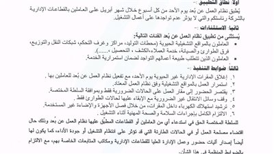 "القابضة للكهرباء" تعتمد نظام العمل عن بُعد يوم الأحد خلال أبريل وتعلن تطبيق عدداً من الضوابط لتعزيز الكفاءة والسلامة